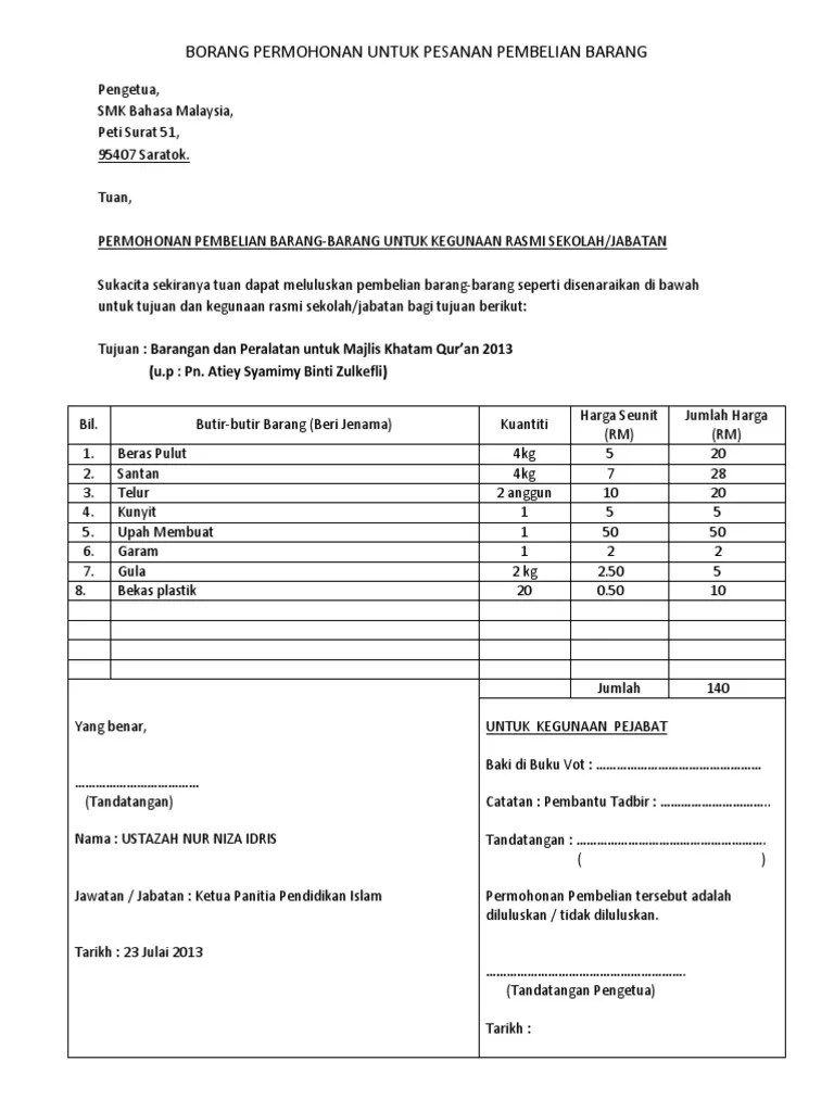 Untuk kegunaan / keperluan bagi. Borang pesanan pembelian asal / pendua/ peniaga · no. Pembelian adalah cara untuk mendapatkan barang atau perkhidmatan atau. Borang permohonan pembelian bekalan / perkhidmatan / kerja (pesanan tempatan). Garis panduan mengenai perolehan bekalan dan perkhidmatan secara pembelian terus. Garis panduan permohonan tapisan keselamatan semula kepada pegawai awam .